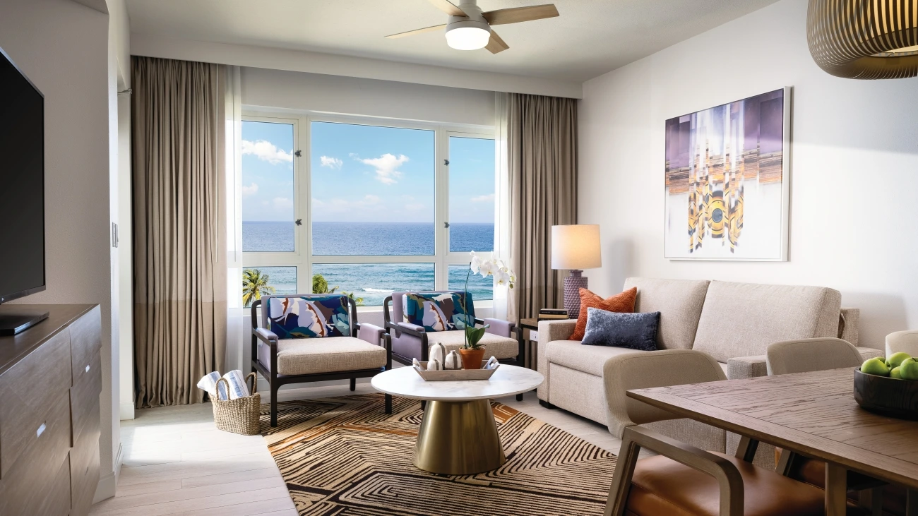 Magnificent ocean, garden, or pool views welcome you to spacious, residential-style accommodations, offering one primary suite with plush king-size Hyatt Grand bed and adjoining bath with walk-in shower. Deluxe amenities include full kitchen, dining area, furnished balcony, washer and dryer, and comfortable living area with queen sofa bed with memory foam mattress, flat-screen TV with Blu-ray player, and wireless high-speed Internet access.